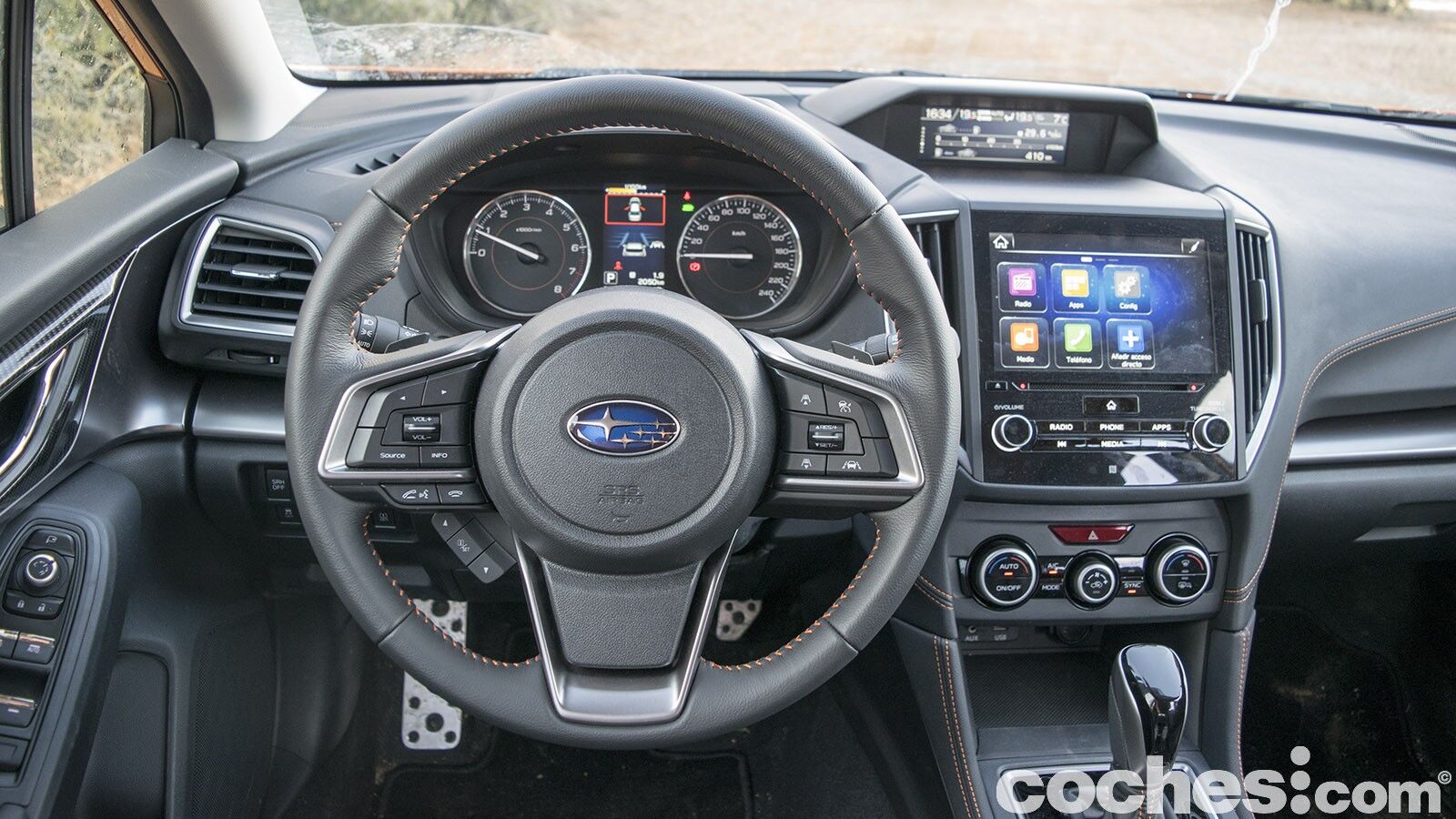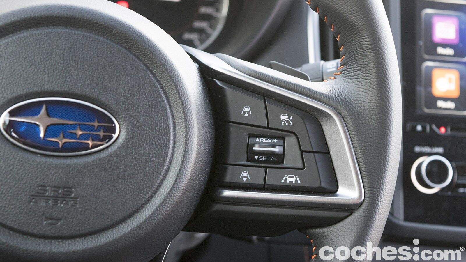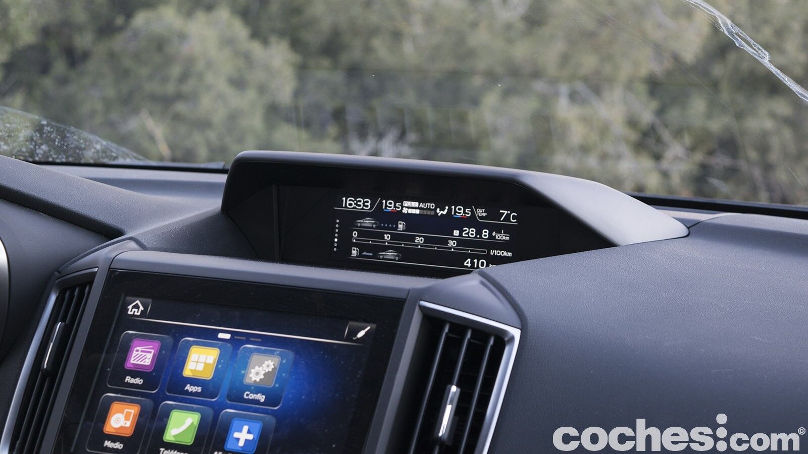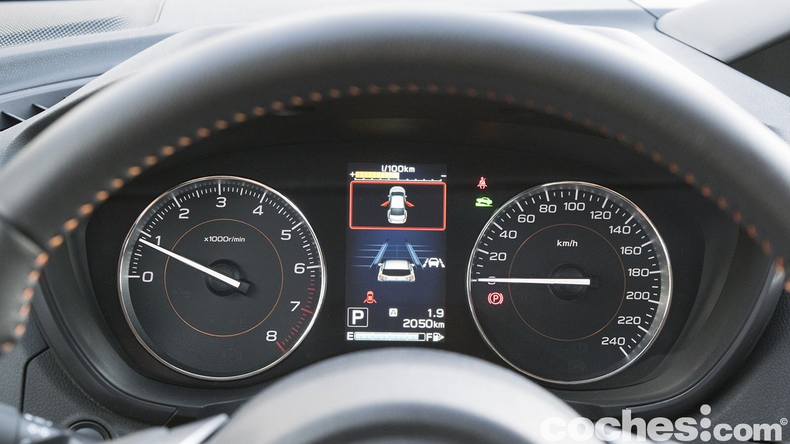 El volante también es un elemento completamente nuevo, más pequeño y ancho, con múltiples mandos. Desde aquí se podrán controlar algunas de las ayudas a la conducción del EyeSight y la instrumentación. Porque detrás del volante vemos unos grandes relojes como los de antes, de fácil lectura. Entre ambas esferas aparecen una pantalla a color que hace las veces de ordenador de a bordo y complementa el resto de información.