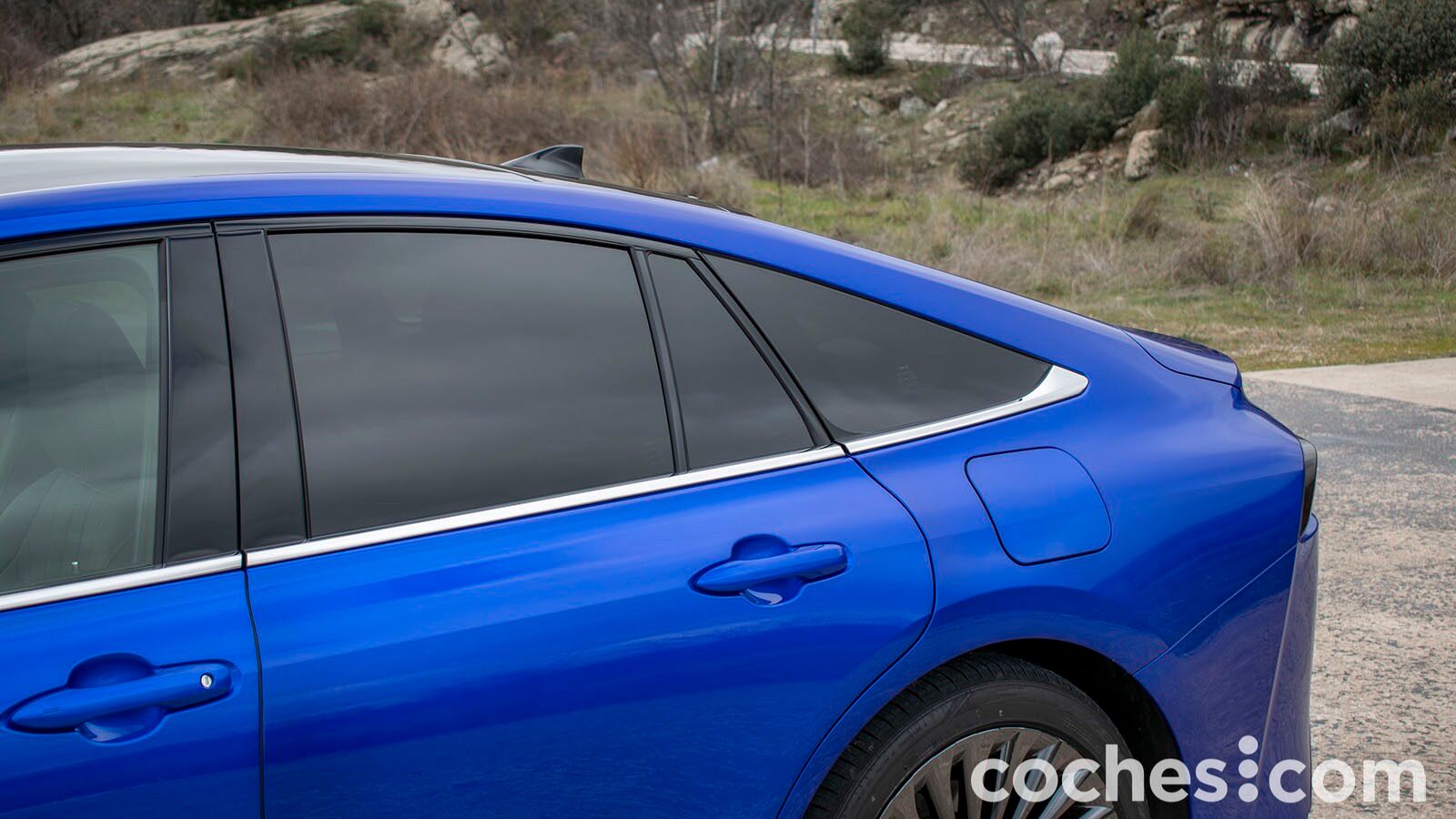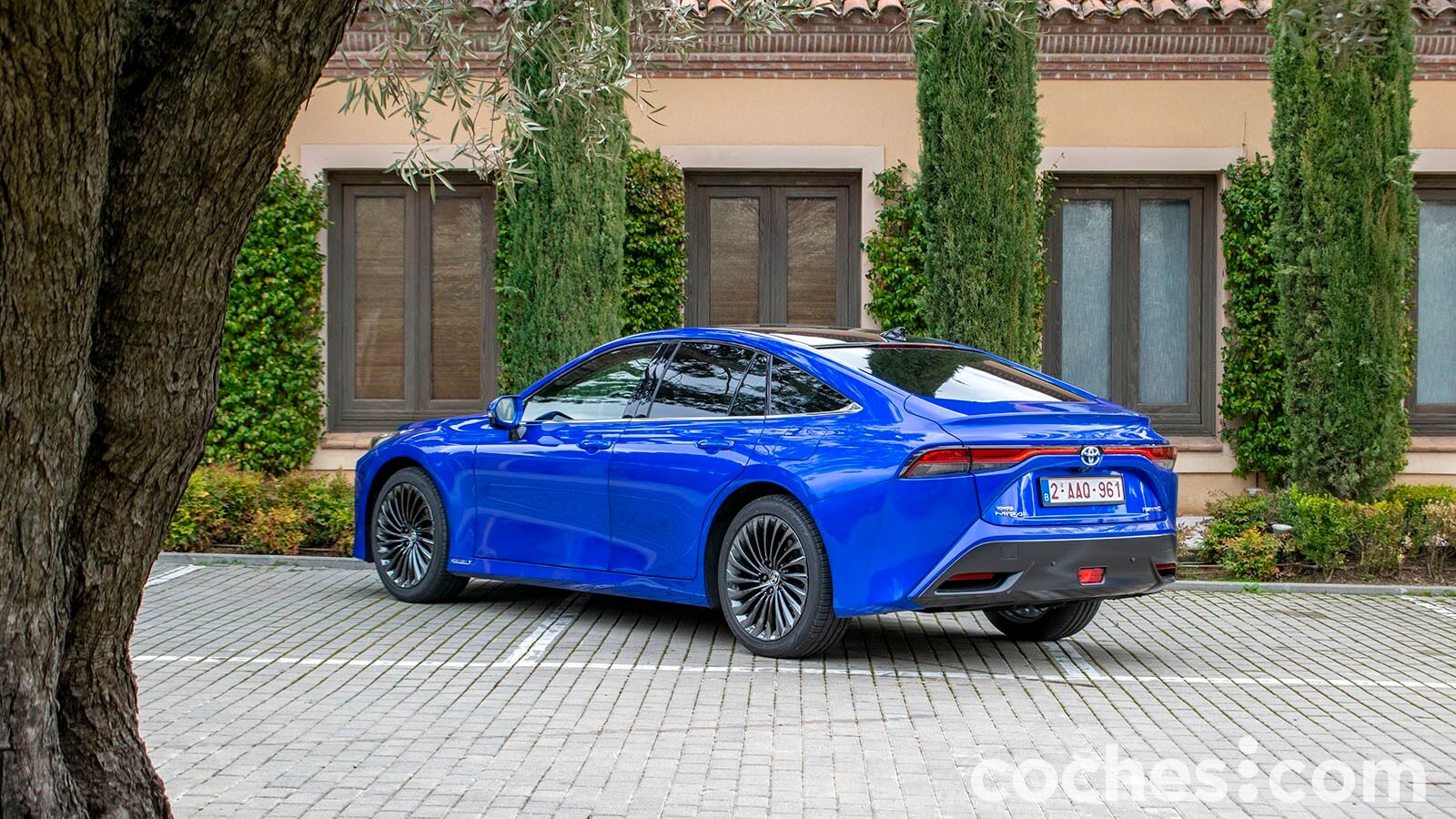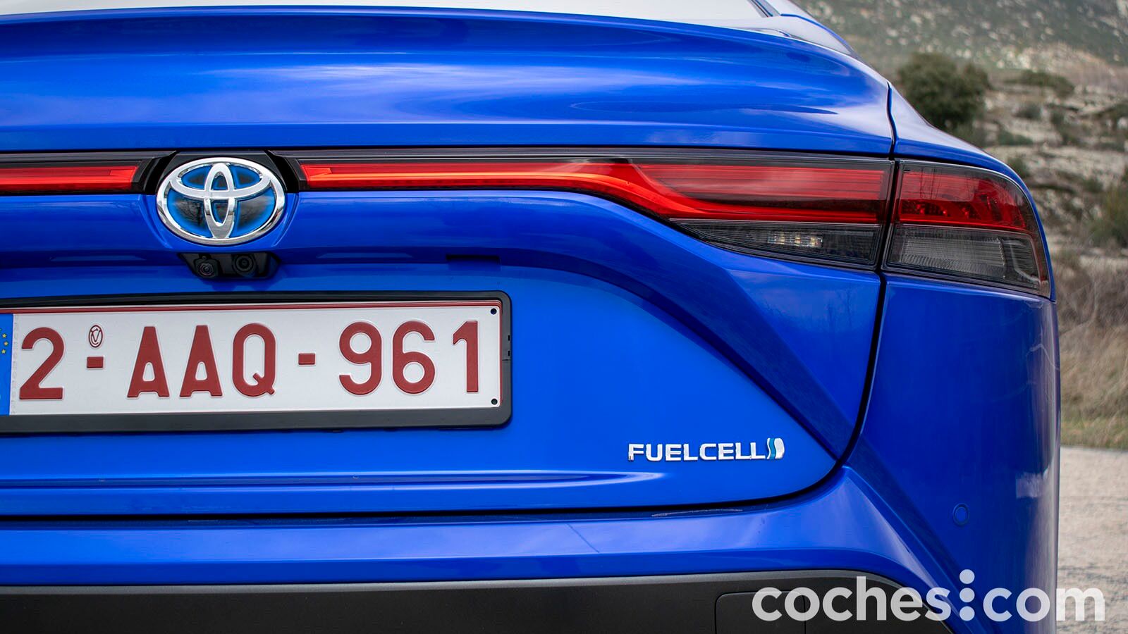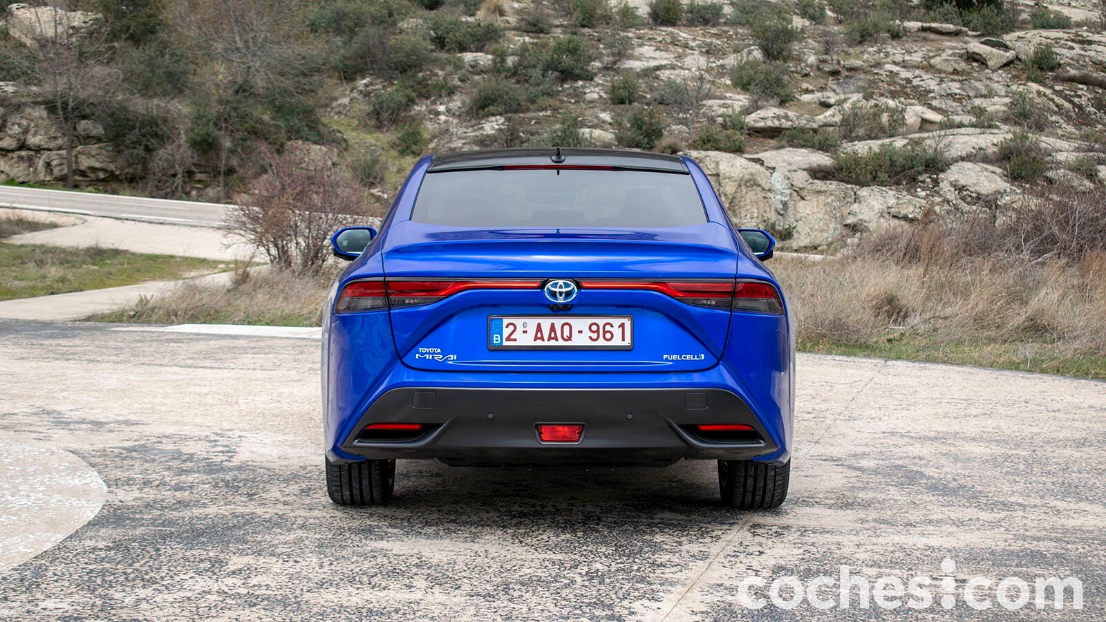 Lo consigue parcialmente por la gran inclinación del pilar C y por la prominente caída del techo, que desemboca en un portón del maletero acabado en un llamativo spoiler. La zaga del Mirai tampoco pasa desapercibida gracias a unos pilotos traseros muy horizontales que van unidos por el centro, convergiendo en el logotipo. La parte inferior cuenta con una especie de difusor en gris que hace contraste con el nuevo color Azul Neptuno que lleva esta unidad.