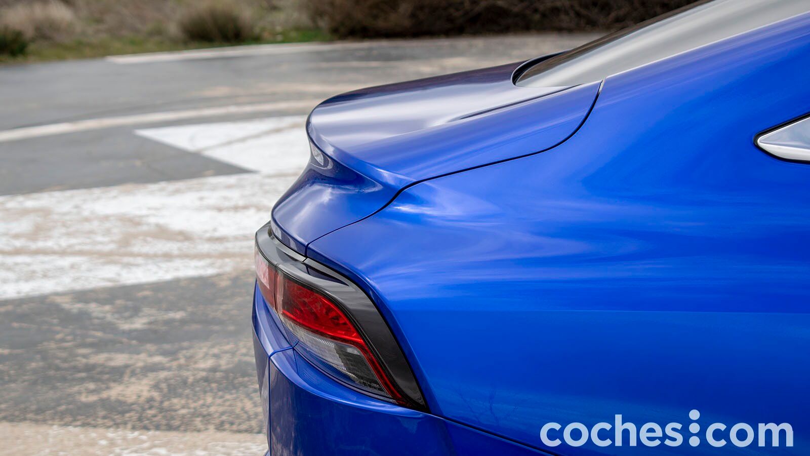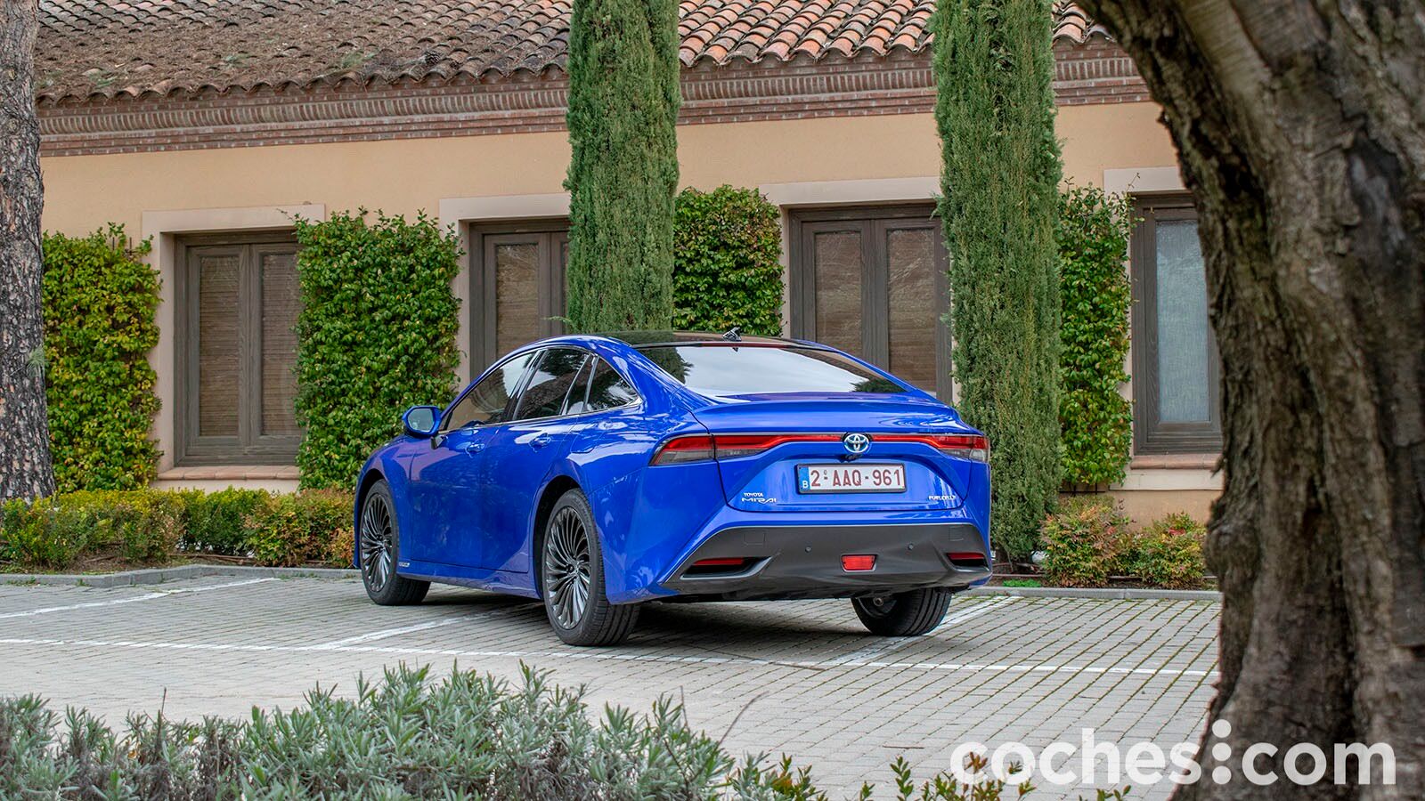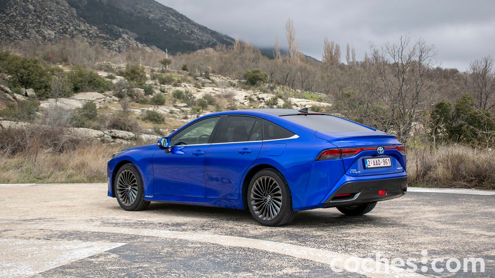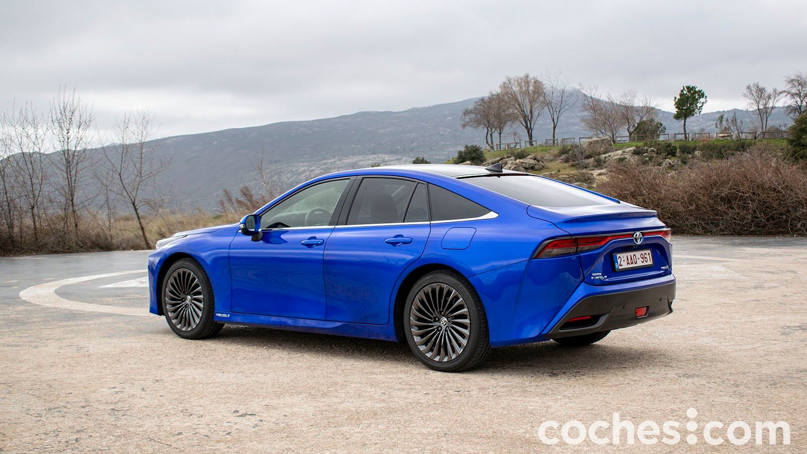 Lo consigue parcialmente por la gran inclinación del pilar C y por la prominente caída del techo, que desemboca en un portón del maletero acabado en un llamativo spoiler. La zaga del Mirai tampoco pasa desapercibida gracias a unos pilotos traseros muy horizontales que van unidos por el centro, convergiendo en el logotipo. La parte inferior cuenta con una especie de difusor en gris que hace contraste con el nuevo color Azul Neptuno que lleva esta unidad.