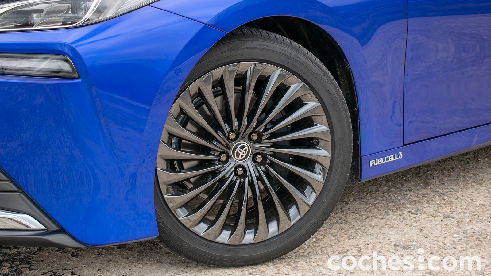 Uno de los aspectos que le dan equilibrio al Toyota Mirai es la suspensión multibrazo en ambos ejes. Mientras que el anterior modelo montaba McPherson delante y multibrazo detrás, ahora cambia el esquema para mejorar el nivel de estabilidad, control y confort en marcha. También suma barras estabilizadoras para darle un punto de rigidez adicional. La dirección tiene un alto grado de asistencia y a veces echamos en falta un poco más de información por su parte.