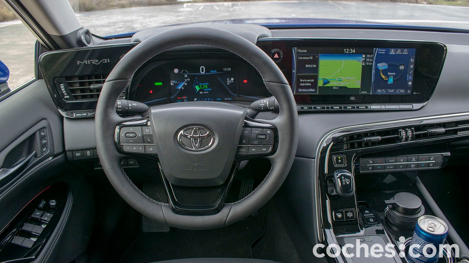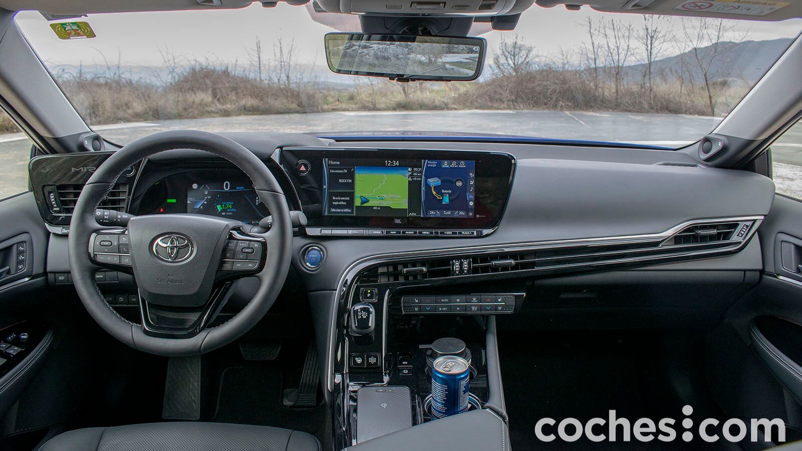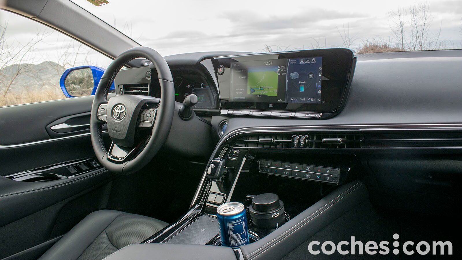 Estamos acostumbrados a que los interiores de la mayoría de modelos de Toyota sean bastante similares, pero el Mirai tenía que destacar en este aspecto. Su habitáculo tiene un diseño diferenciado y asimétrico, con una consola central prominente que integra un pequeño selector del cambio en una posición elevada y cercana al volante. Esa zona también cuenta con carga inalámbrica para smartphone, reposabebidas y los controles de la climatización analógicos.