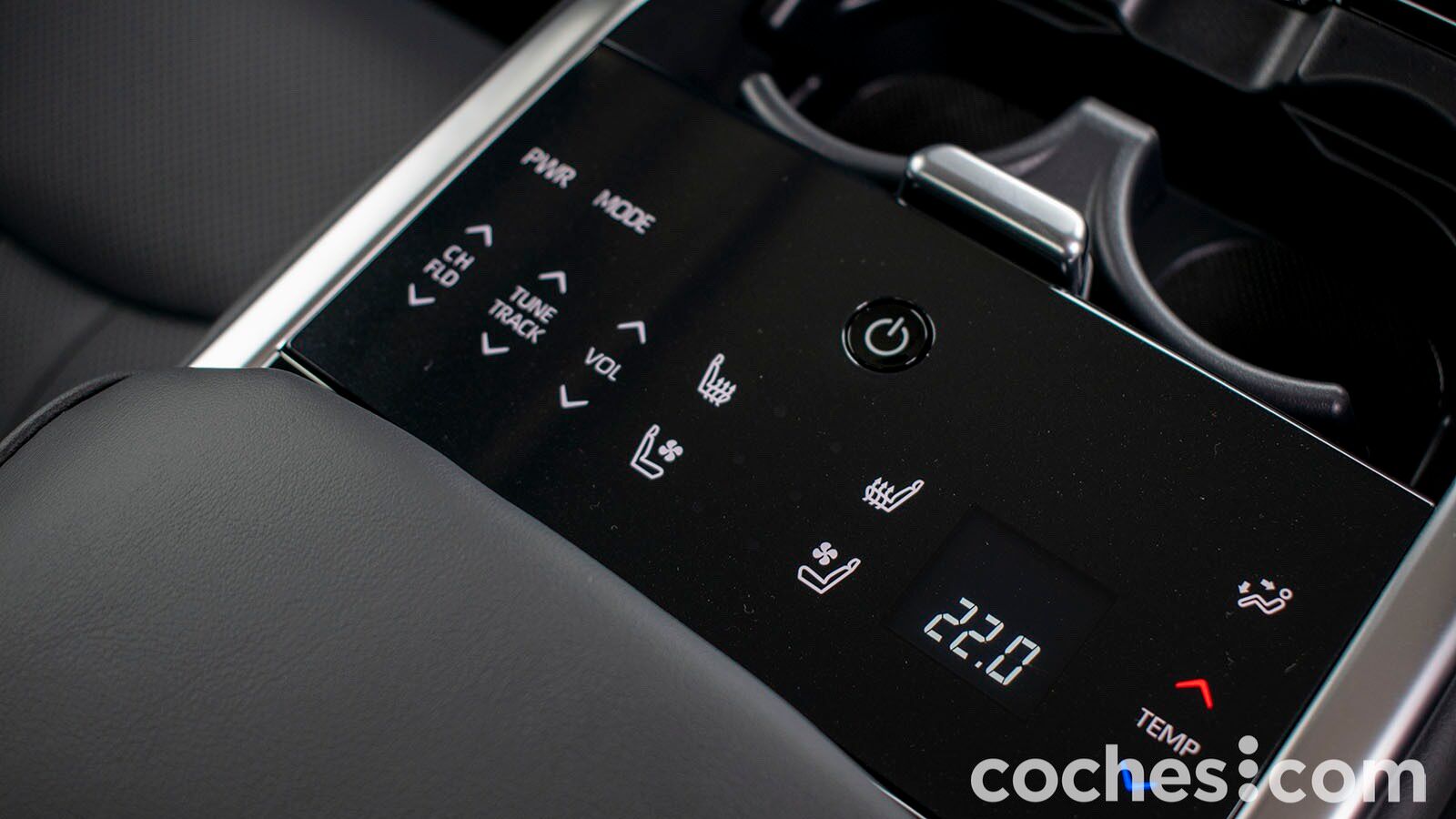 Por suerte, de esta plaza sale una consola central cuando no se utiliza. Es un reposabrazos perfecto, también permite dejar objetos y lo mejor es que integra algunas funciones. Tiene botones para llevar a cabo acciones como cambiar de canción, subir el volumen y también controlar la climatización, que es trizona y permite ajustar una temperatura diferente en esta segunda fila de asientos. Curiosamente, las plazas laterales también son calefactables y ventiladas como las delanteras.