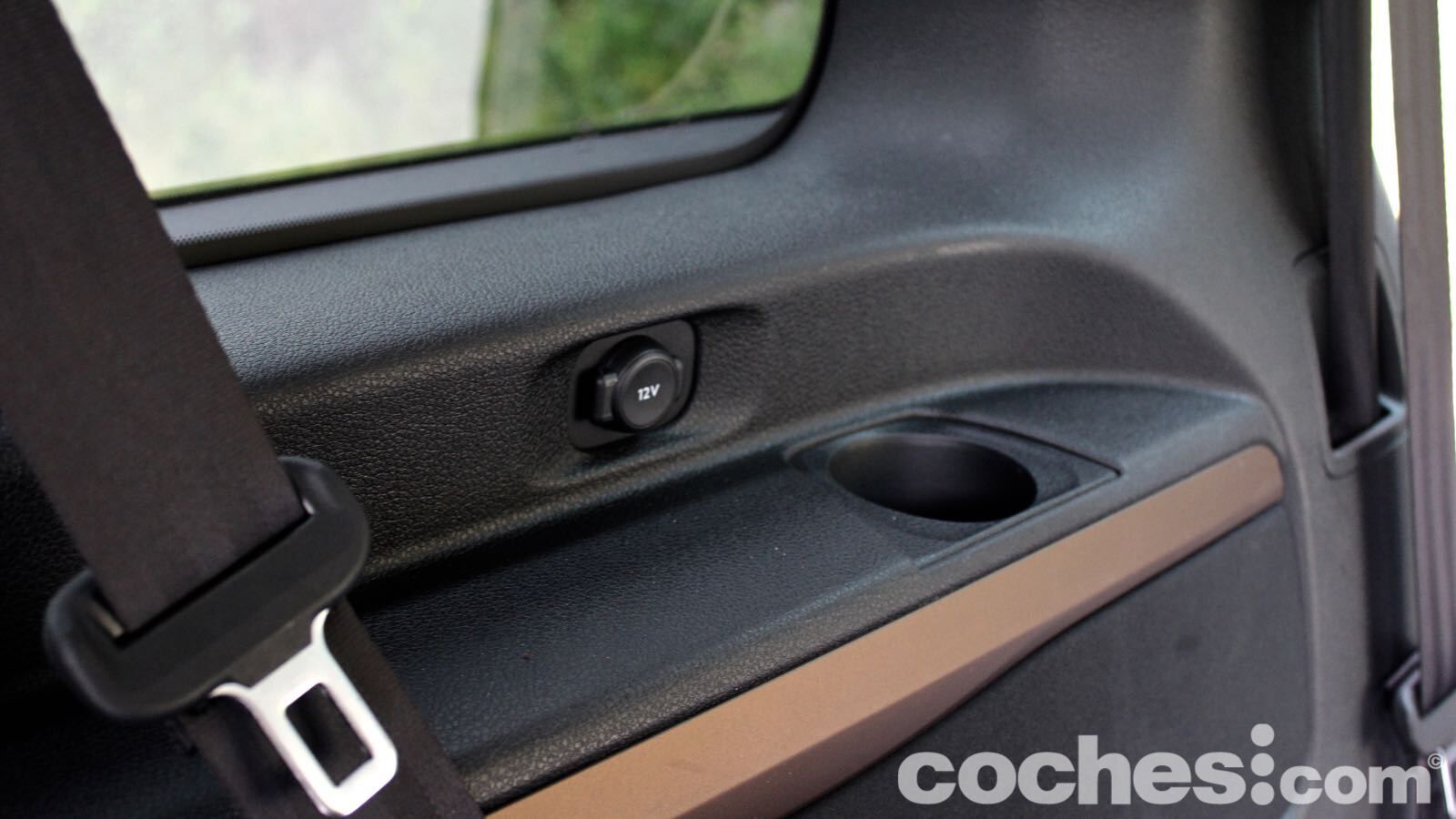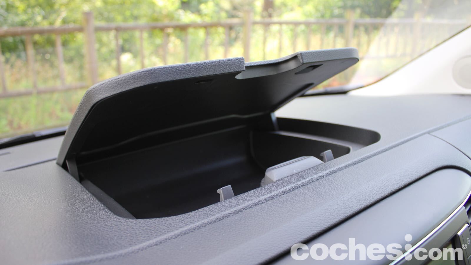 Entre los asientos encontramos un espacio que quizá podría aprovecharse más que para ubicar la palanca del freno de mano. No por falta de espacio para dejar objetos, pues contamos con una buena doble guantera ante el asiento del acompañante y otro hueco con tapa en el centro de la parte alta del salpicadero. También reposabebidas en los extremos de este… y las habituales bolsas de las puertas, pero algo alejadas (quedan muy abajo) para usarlas mientras vas conduciendo.