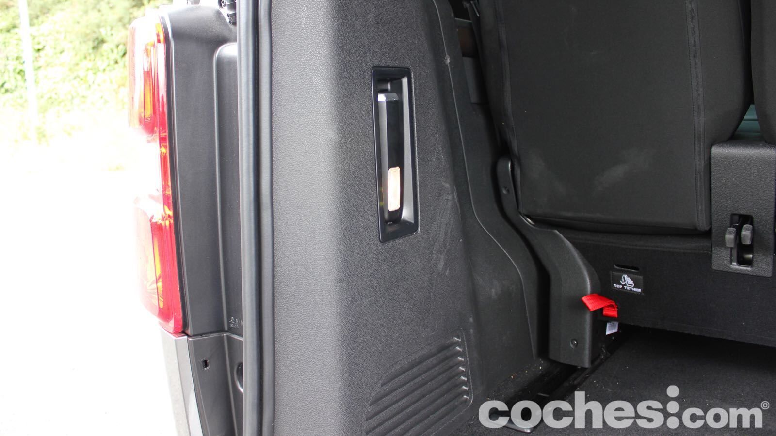 En la zaga nos encontramos con un portón enorme. Con esto la marca pretende separarse de las versiones comerciales, que tienen dos puertas laterales. Está genial contar con todo el espacio diáfano a la hora de cargar y, cuando llueve, sirve de refugio improvisado, pero necesitas mucho espacio libre tras el coche para abrirlo debido a sus dimensiones.