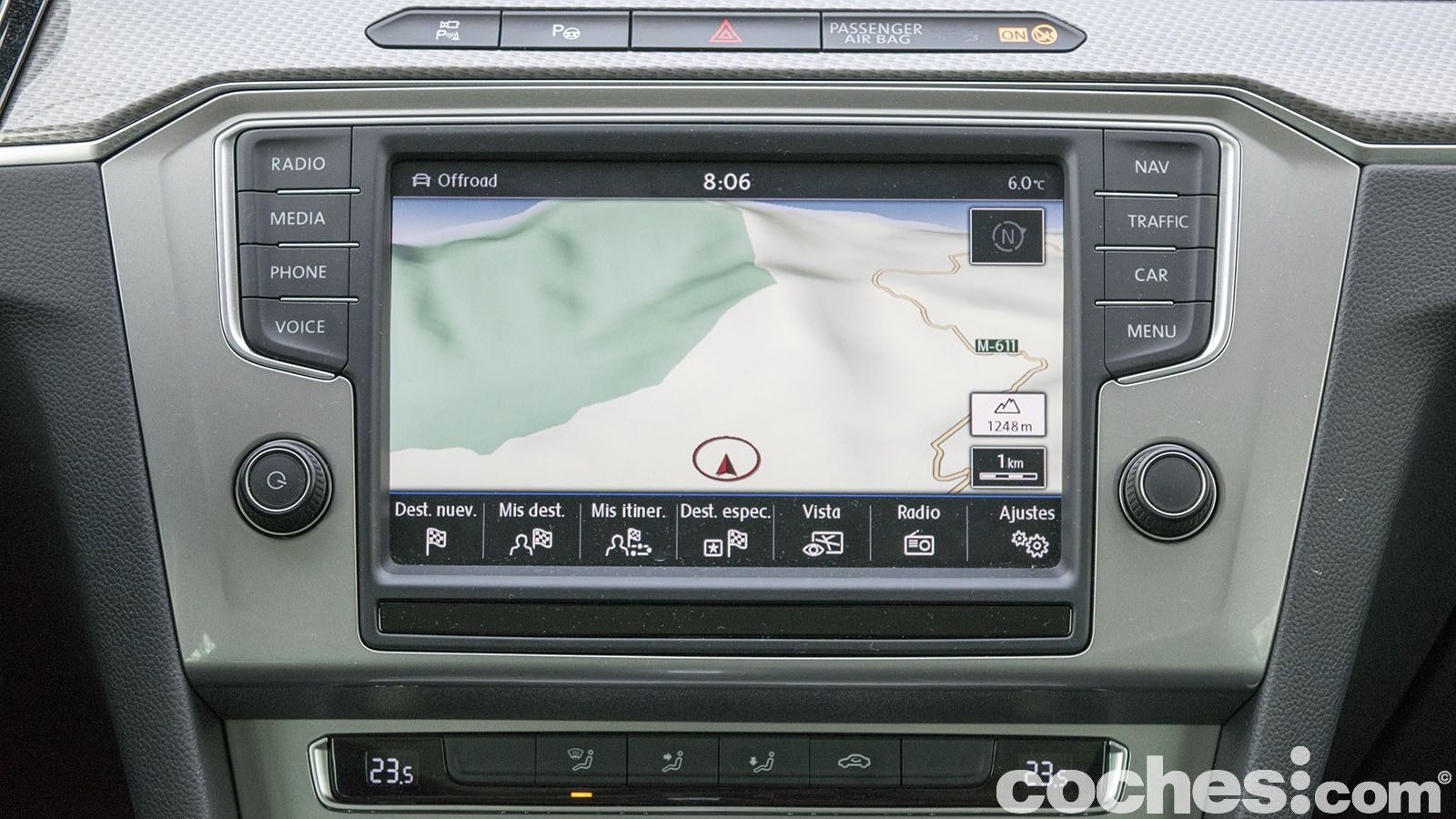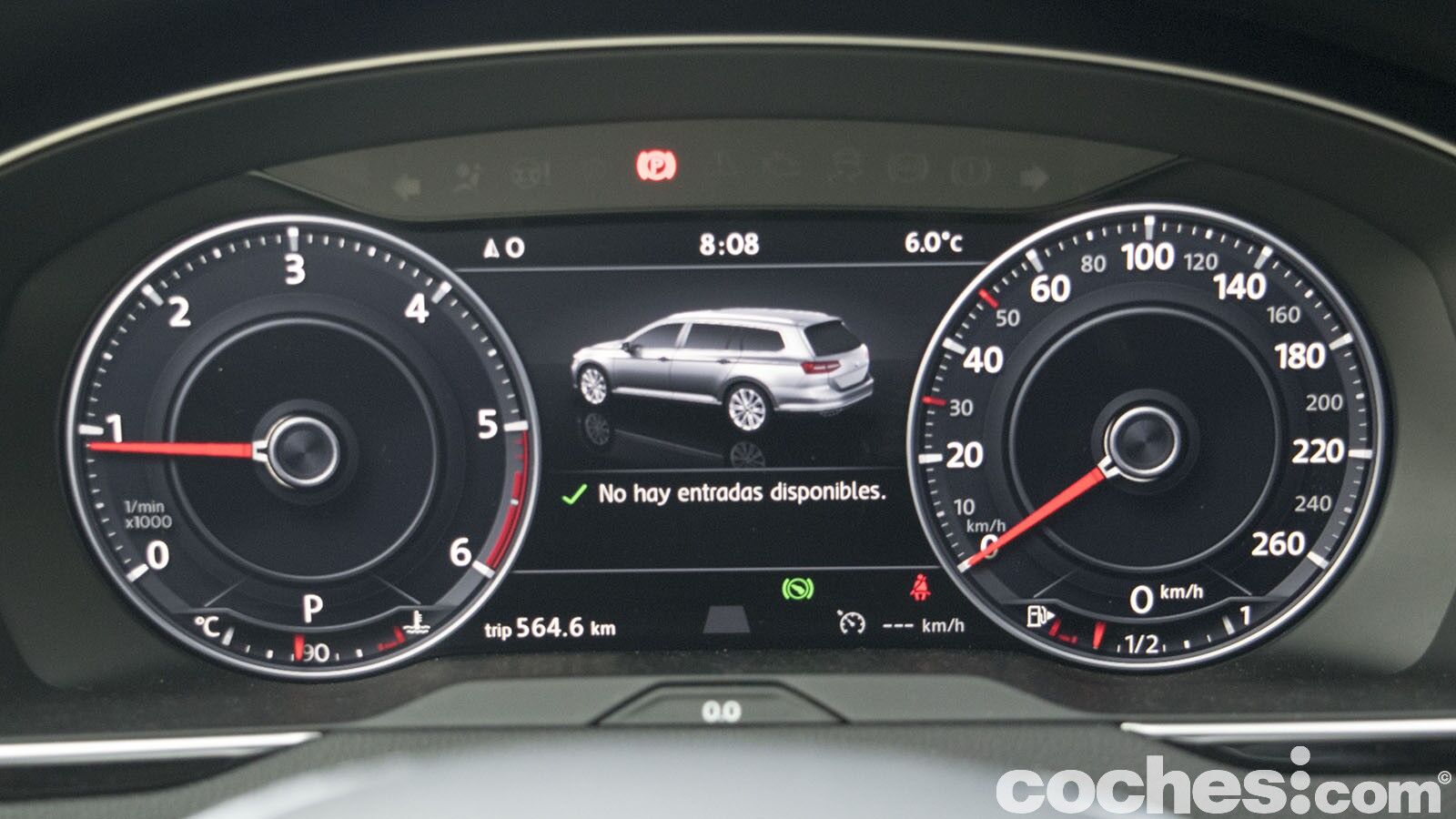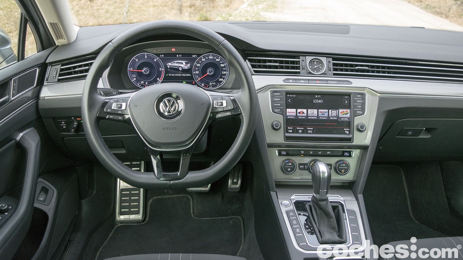 La consola central recibe una gran pantalla táctil de 8 pulgadas desde la que se controlan todas las funciones del sistema multimedia. Por debajo están los controles de la climatización (trizona en nuestra unidad) y en la zona de la palanca de cambios tenemos unos cuantos botones más para arrancar el motor o cambiar los modos de conducción. Un elemento que destaca y que es de serie en el Passat Alltrack es el Volkswagen Digital Cockpit, la instrumentación digital formada por una pantalla de 12,3 pulgadas.