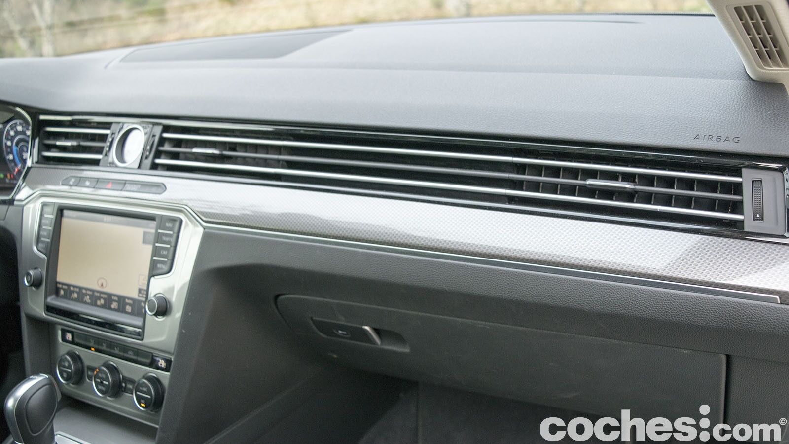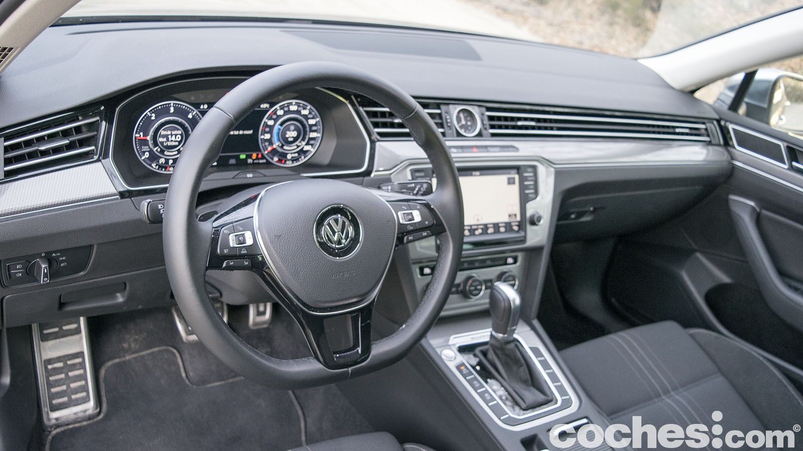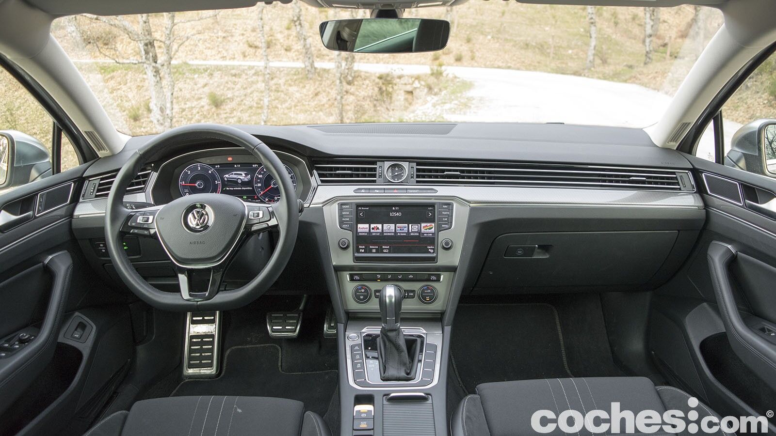 La consola central recibe una gran pantalla táctil de 8 pulgadas desde la que se controlan todas las funciones del sistema multimedia. Por debajo están los controles de la climatización (trizona en nuestra unidad) y en la zona de la palanca de cambios tenemos unos cuantos botones más para arrancar el motor o cambiar los modos de conducción. Un elemento que destaca y que es de serie en el Passat Alltrack es el Volkswagen Digital Cockpit, la instrumentación digital formada por una pantalla de 12,3 pulgadas.