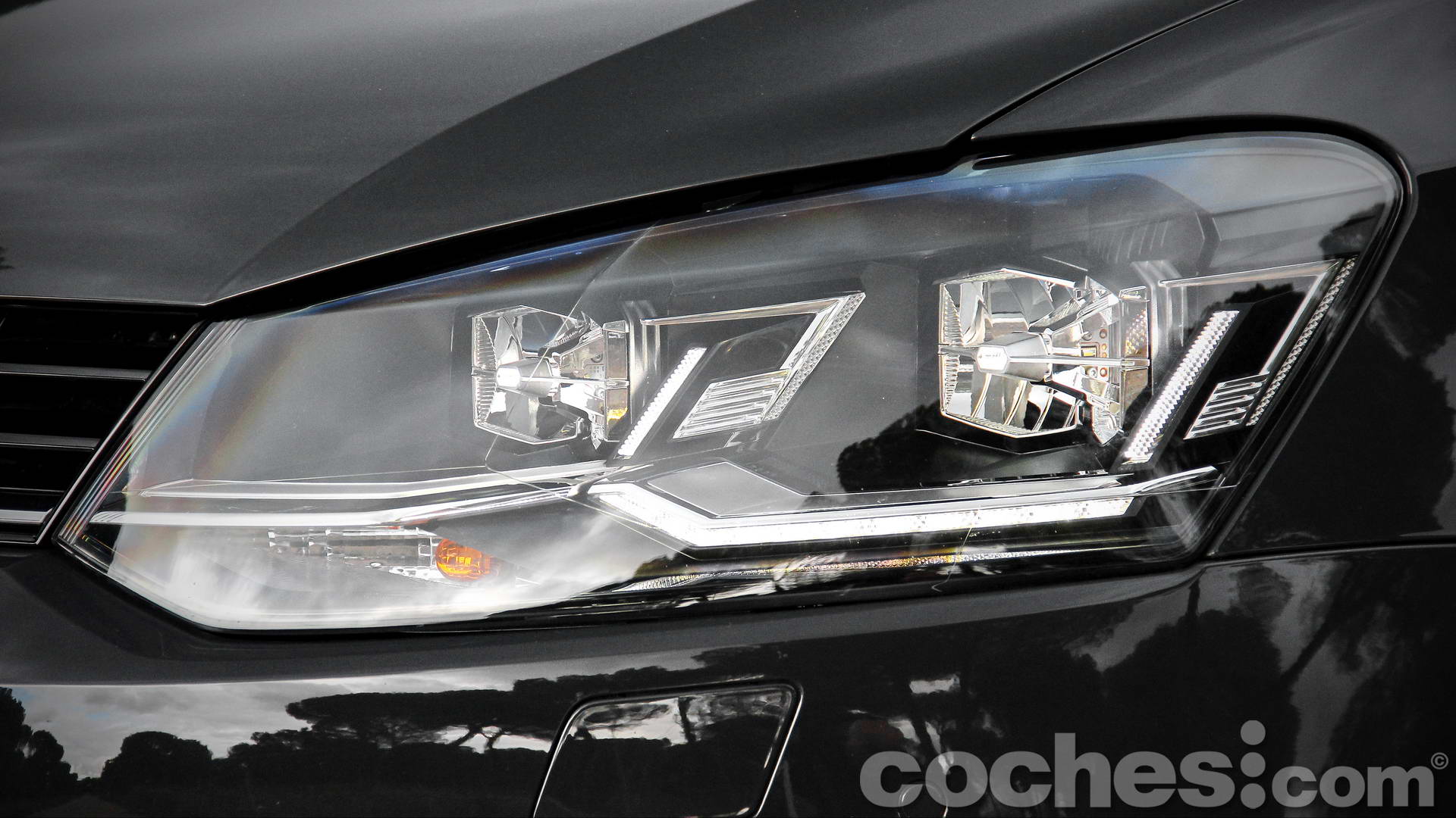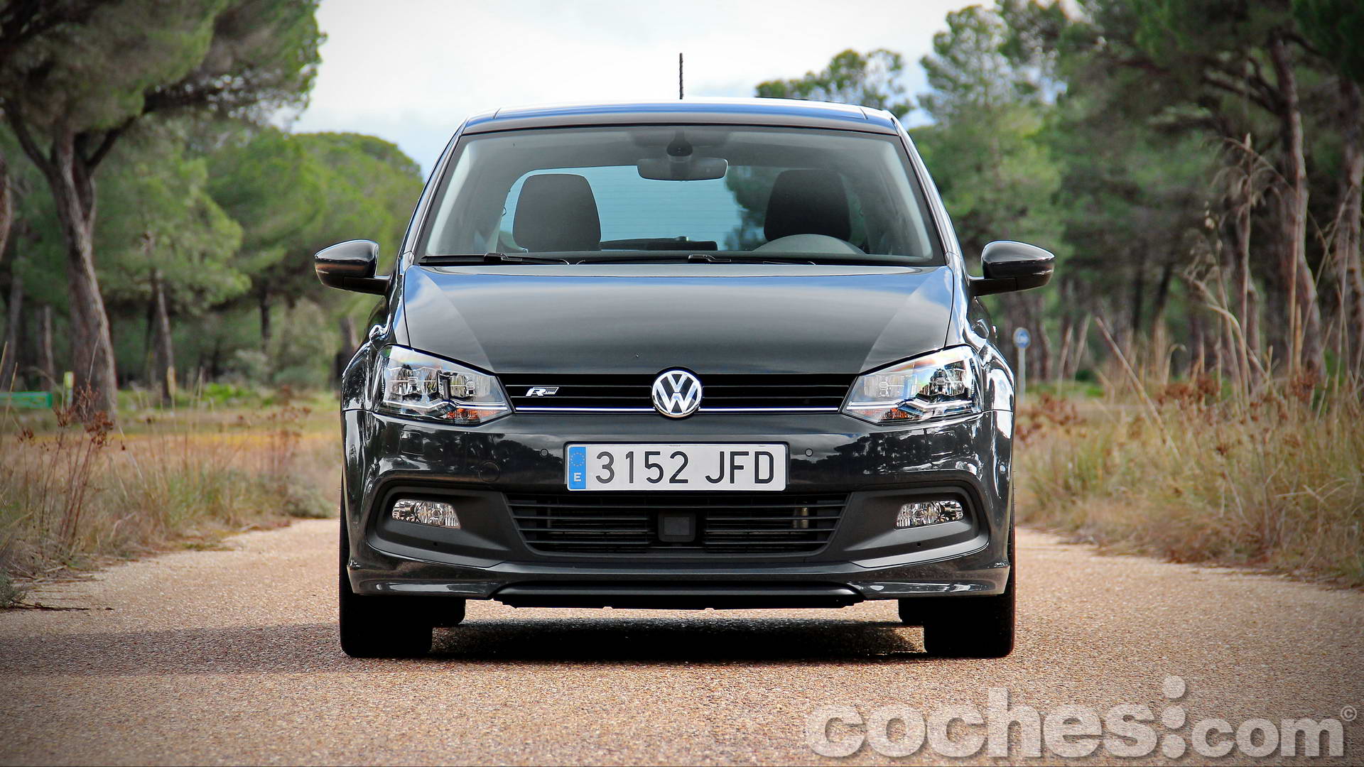 Como decíamos antes, nuestra unidad de pruebas no es un Polo al uso, sino una versión con una dosis de picante… sin abrasar. La parrilla lisa destaca la anchura del modelo, pero además en el frontal cuenta con un paragolpes específico del paquete R-Line, bajo esa parrilla en la que destaca el emblema R-Line. En la parte baja se encuentra una entrada de aire de generosas dimensiones que, al estar acabada en negro brillante, que busca contrastar con el resto de la carrocería (no tanto en nuestra unidad, muy oscura). Es ahí donde se ubican los faros antiniebla con luz de giro y la luz diurna.