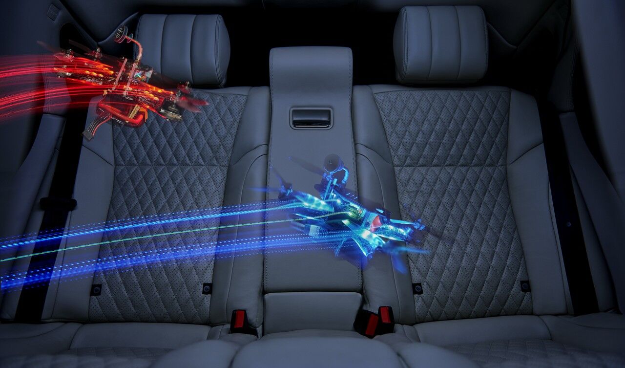 Con las luces apagadas y la única iluminación de las puertas comenzaba esta carrera en la que estos aparatos llegan a alcanzar velocidades de casi 100 km/h. Parece que los 13 centímetros extra que consigue la variante de batalla extendida ayuda bastante en la espectacular carrera, en la que los drones también pasan por debajo de un Jaguar XJ elevado. Finalmente gana el azul, que se va a casa montado en el flamante Jaguar XJR575.