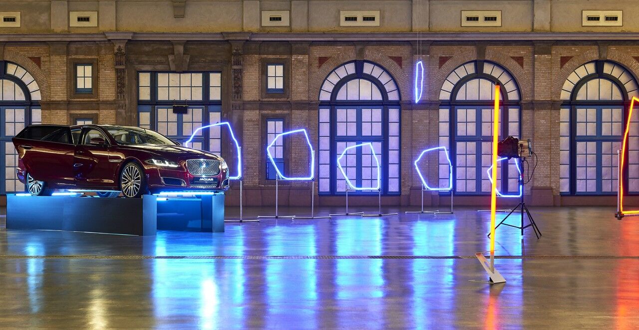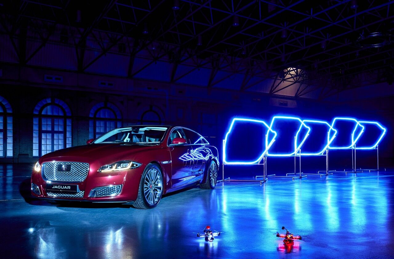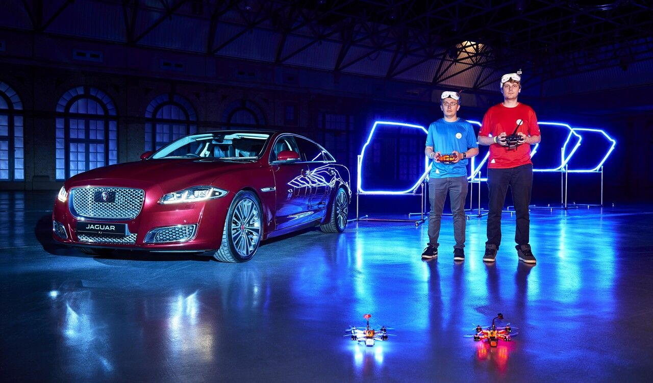 Carrera de drones con el Jaguar XJ formando parte del circuito