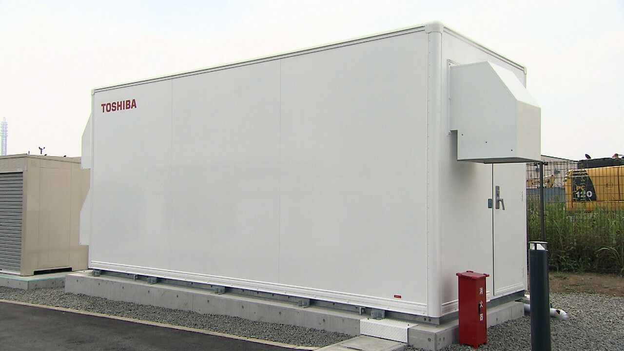 Junto a las baterías de almacenamiento, en otra instalación aparte identificada con el logotipo de Toshiba, se encuentra un sistema mediante el cual se produce el hidrógeno. Gracias al proceso de electrolisis se dividen los elementos que componen el agua (H2O) y se extrae el hidrógeno, liberando el oxigeno nuevamente a la atmósfera.
