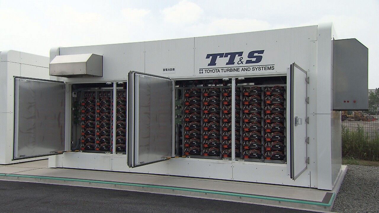 Junto a la torre del aerogenerador hay una especie de hangares de almacenamiento de color blanco en cuyo interior se encuentran apilados ordenadamente objetos rectangulares con forma de baterías. Y eso es precisamente lo que son, baterías recicladas procedentes de decenas de Toyota Prius cuyo fin es almacenar sistemáticamente la energía eléctrica sobrante del Hama Wing. La longitud del conjunto supera la de 180 Toyota Prius alineados.