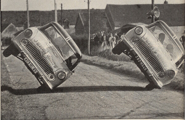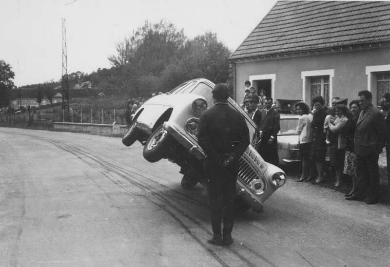 Su primer trayecto lo realizó con un Simca con tracción trasera que le permitió recorrer el trayecto de París a Chartres, una carretera de aproximadamente 100 km. En el siguiente vídeo se puede ver como pasea en un ángulo de 45 grados por las calles y entre el tráfico cotidiano. Pero su habilidad no solo le permitía realizar acrobacias aéreas sino que también se adentraba en el mundo del slalom entre personas posicionadas como conos. La regla era “nunca caer”.