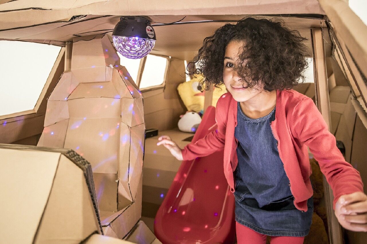 En el interior se puede encontrar una tablet en la consola central y un sistema de sonido Cantón, en lugar del sistema multimedia Columbus del coche de serie. La bola de discoteca multicolor sustituiría a la iluminación ambiental. No faltan tampoco el proyector, una caja de juguetes o conexión WiFi. Con los asientos abatidos el maletero del Karoq alcanza los 1.810 litros y en este de cartón se ha instalado una piscina de bolas con tobogán incluido. Bajo el capó, en lugar del motor, hay una guarida secreta desde la que se puede vigilar a través de los agujeros en los faros.