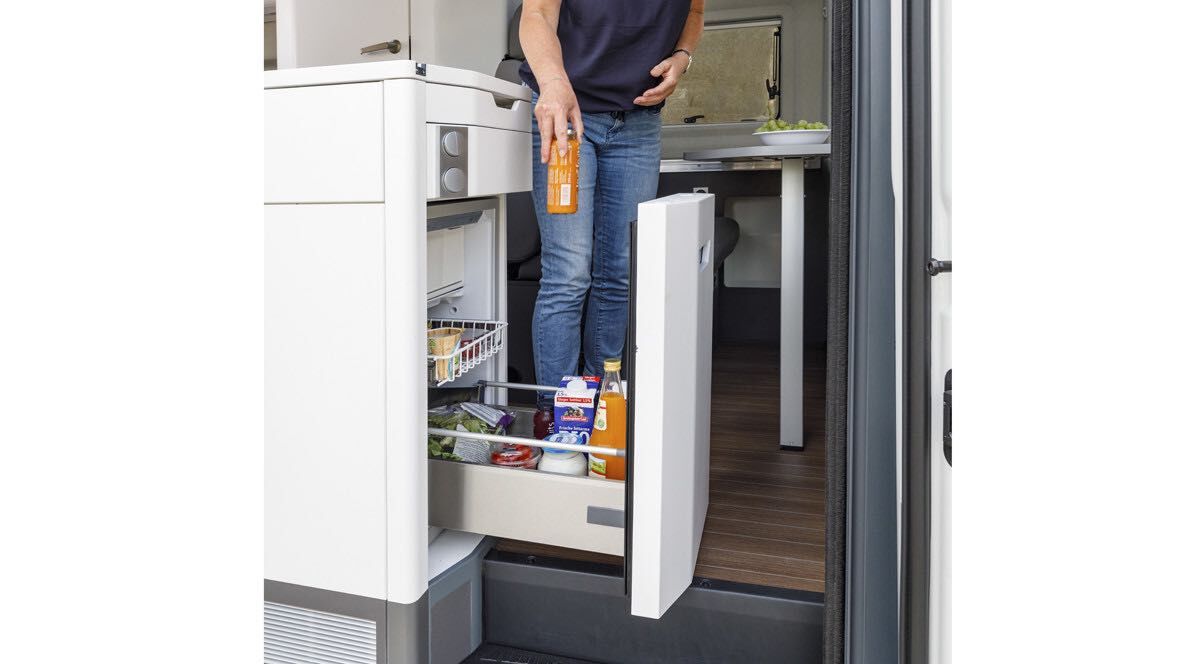 No falta una cocina, con dos hornillos de gas y un fregadero y se mantiene una idea que ya habíamos visto en el prototipo, el frigorífico y congelador, con 70 litros de capacidad justo al lado de la entrada, que cuenta por cierto con un escalón eléctrico que facilita el acceso al vehículo. Hay también otros compartimentos y un pequeño salón (con mesa para cuatro) justo tras el puesto de mando, que obviamente cuenta con asientos delanteros giratorios.